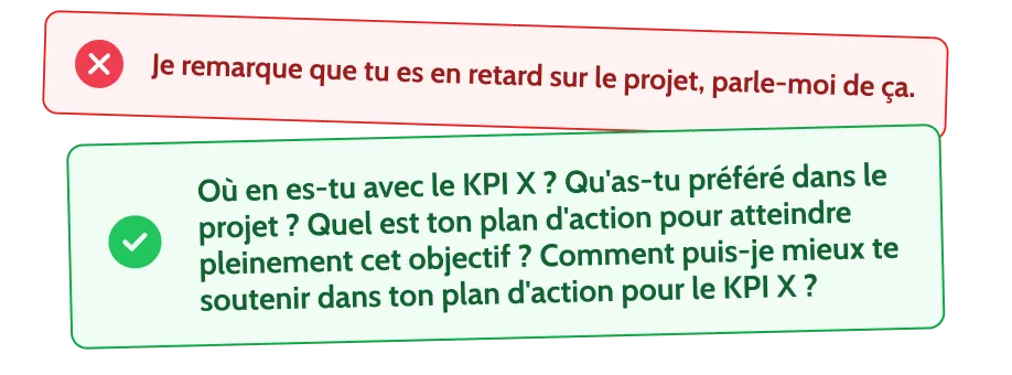 Ne partez pas du principe que l’erreur vient de l’employé. Parfois, les délais et les défis peuvent également être retardés par d’autres éléments. Gardez toujours une approche ouverte et constructive, posez des questions et écoutez.