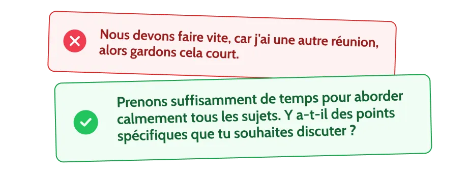 Prenez le temps pour l’entretien et assurez-vous de prévoir suffisamment de temps pour discuter de tous les points. Les entretiens précipités peuvent mener à **des évaluations incomplètes **et à des occasions manquées d’amélioration.