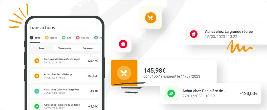 Avec votre app Monizze, vous pouvez transférer des transactions d’un type de chèque à un autre et réactiver vos chèques. Et pour faciliter les remboursements entre collègues, payez avec Monizze et faites-vous rembourser directement en chèques-repas.